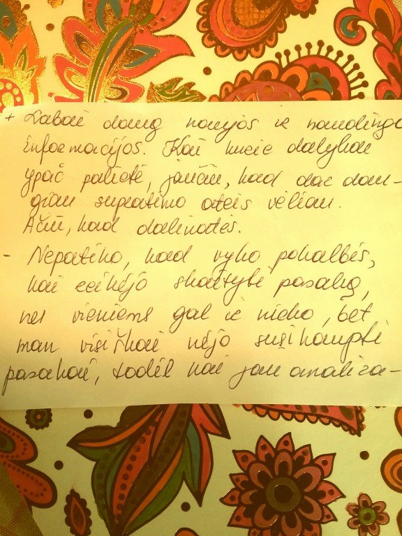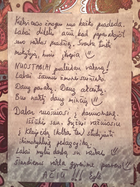 Esu laiminga, ir dar vis išgyvenu to ketvirtadienio akimirkas. Man buvo didelis džiaugsmas susitikti ir dalintis savo atradimais su jumis, mieli pasakų ir savo gyvenimų bičiuliai. Gera, kad tos trys, pradžioje gąsdinusios jus valandos, ne tik neprailgo, bet pasirodė per trumpas laiko tarpas prasmingam pasakų kelio savo gyvenimams pritaikymui. Esu sujaudinta, jei sakote, jog jus įkvėpiau. Smagu girdėti apie ketinimus įvesti naują - pasakų su vaikais (ne vaikams) skaitymo – tradiciją, kitą kartą atsivesti savo artimą, ar jaučiantis jus įgijus paprastus, be ne prastus įrankius „pasireguliuoti“ savo būtį. Man labai svarbi jūsų (profesionali?) palanki nuomonė dėl užsiėmimo struktūros, komunikavimo būdo. Gera, jei mano laikysena, iškalba, humoro jausmas bei užsidegimas paliko jums teigiamą įspūdį. Malonu žinoti, jog nuostabiai praleidote laisvalaikį, kaip ir jus manant, mane spinduliuojant šilumą. Tikrai nekarščiavau .